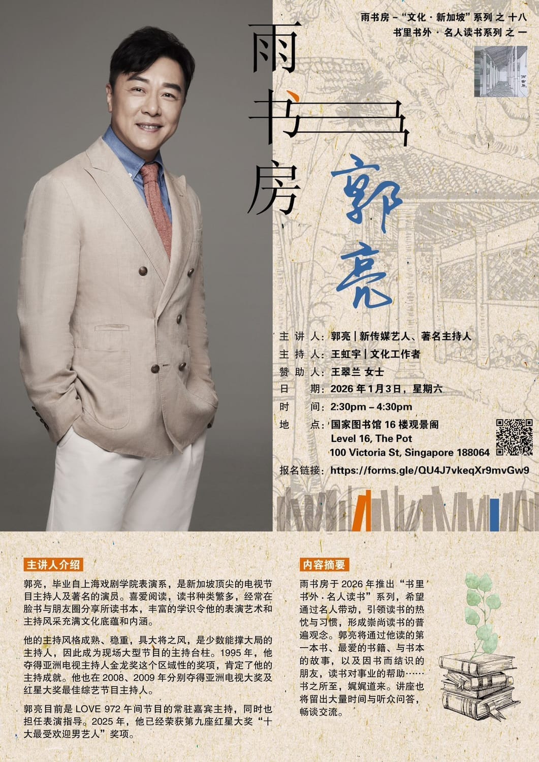 雨书房于2026年推出“书里书外.名人读书”系列,希望通过名人带动,引领读书的热忱与习惯,形成崇尚读书的普遍观念。郭亮将通过他读的第一本书、最爱的书籍、与书本的故事,以及因书而结识的朋友,读书对事业的帮助…… 书之所至,娓娓道来。讲座也将留出大量时间与听众问答,畅谈交流。